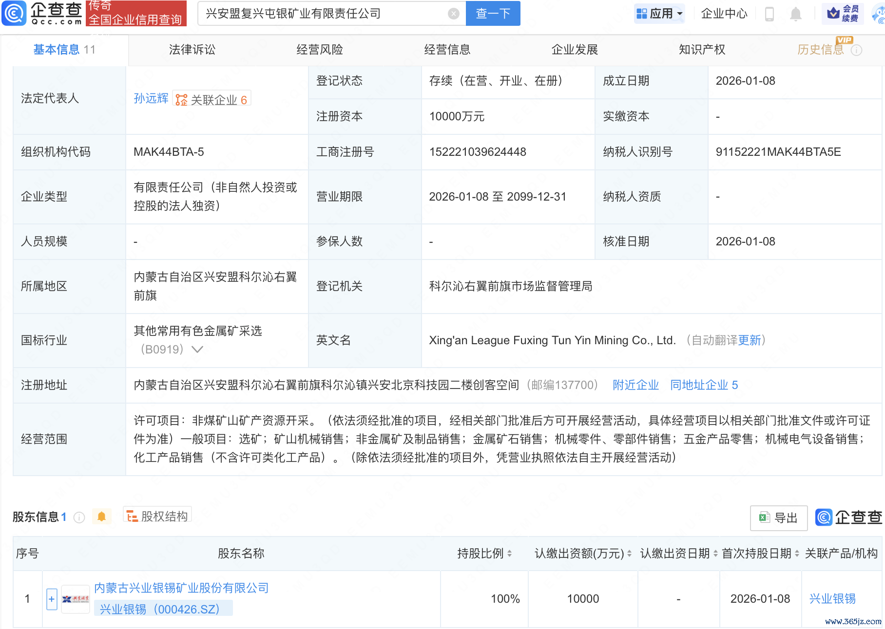 近日,兴安盟复兴屯银矿业有限责任公司成立,注册资本1亿元,经营范围包含:非煤矿山矿产资源开采;矿山机械销售;非金属矿及制品销售;金属矿石销售等。企查查股权穿透显示,该公司由兴业银锡(000426)全资持股。